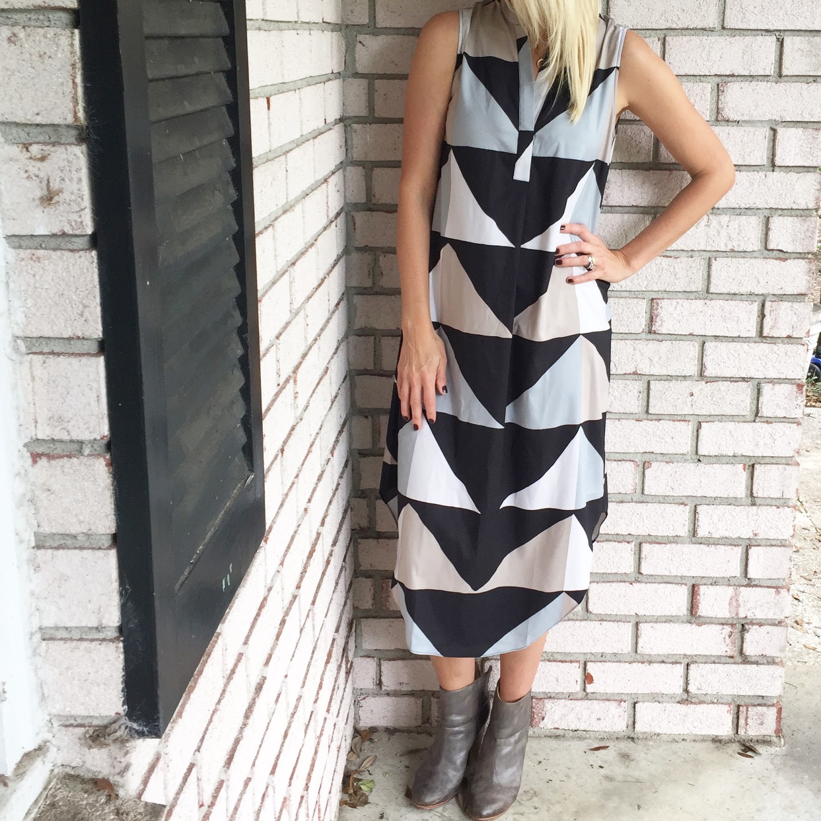 I just bought this dress last weekend. I own this in the same style in a green Summer print and just love the gray geometric for Fall. This dress looks great with booties and heels and I plan to toss on a leather jacket with it once it gets cooler. Currently on sale too! Use code FRIENDS to take 25% off.