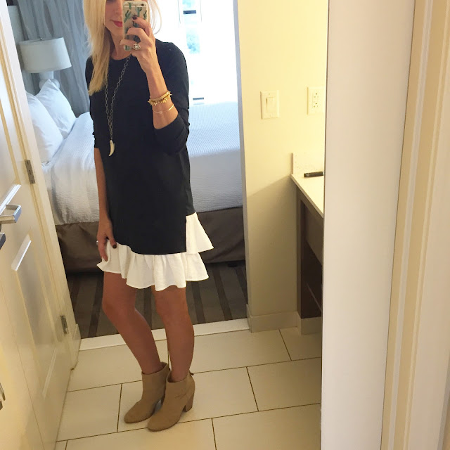 This is what I wore Saturday night. I am now kind of obsessed with the Clu brand. The dress is actually made out of cotton and it so comfortable but you can dress it up or down. I paired mine with booties but it was also super cute with heels.