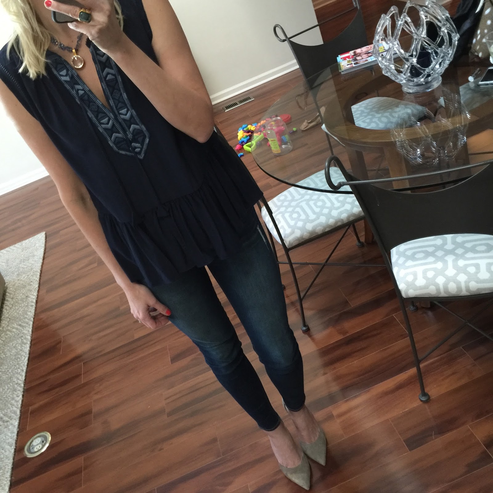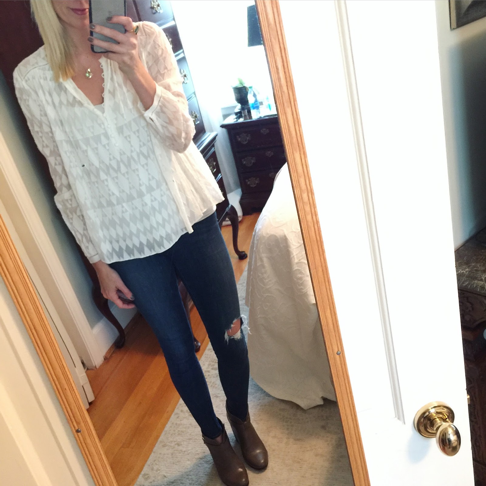 I always love a good white blouse. I like the faint pattern on this one. It is on sale right now too:) You do need a tank underneath because it is slightly sheer.