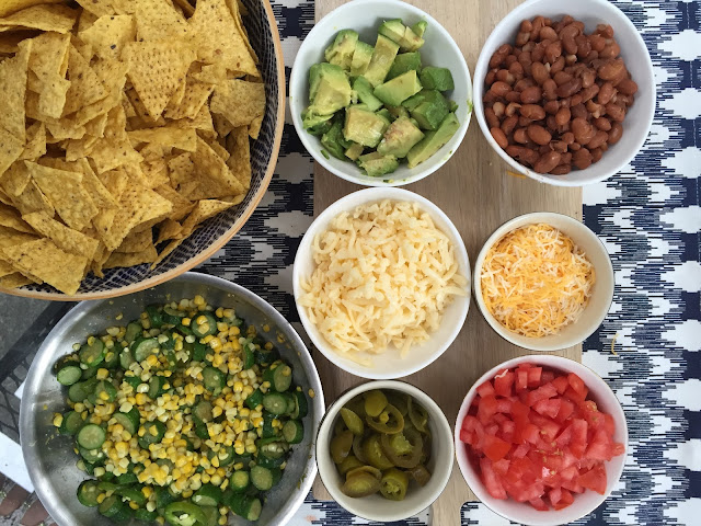 The sauteed zucchini and corn really add some fun dimension to the nachos. It is a great way to use up all those delicious end of Summer veggies. You can use any two cheeses but I love the Mexican blend and the Quesadilla melting cheese. Top with sour cream and salsa and you have a tasty meat free meal.