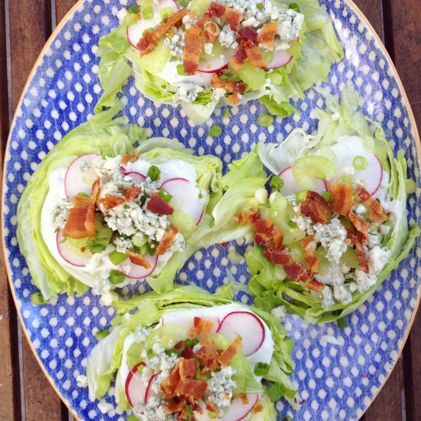 For the salad, combine the celery, radishes, and scallions in a bowl. Slice the head of iceberg across to make about 4-5 3/4 inch rounds. Place on a dinner plate. Spoon the dressing over the lettuce and sprinkle the veggie mix on top. Top with blue cheese and I added bacon:)