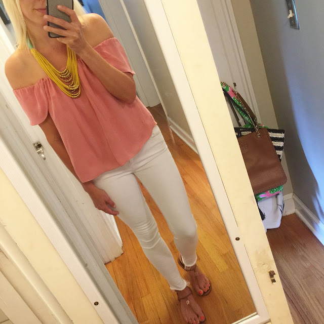 I have this blouse in the pink version and wear it often. It is super cute with jeans or jean shorts.