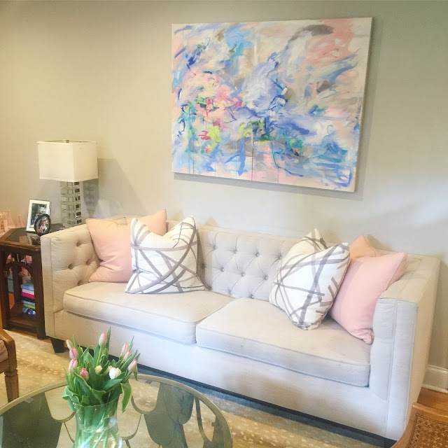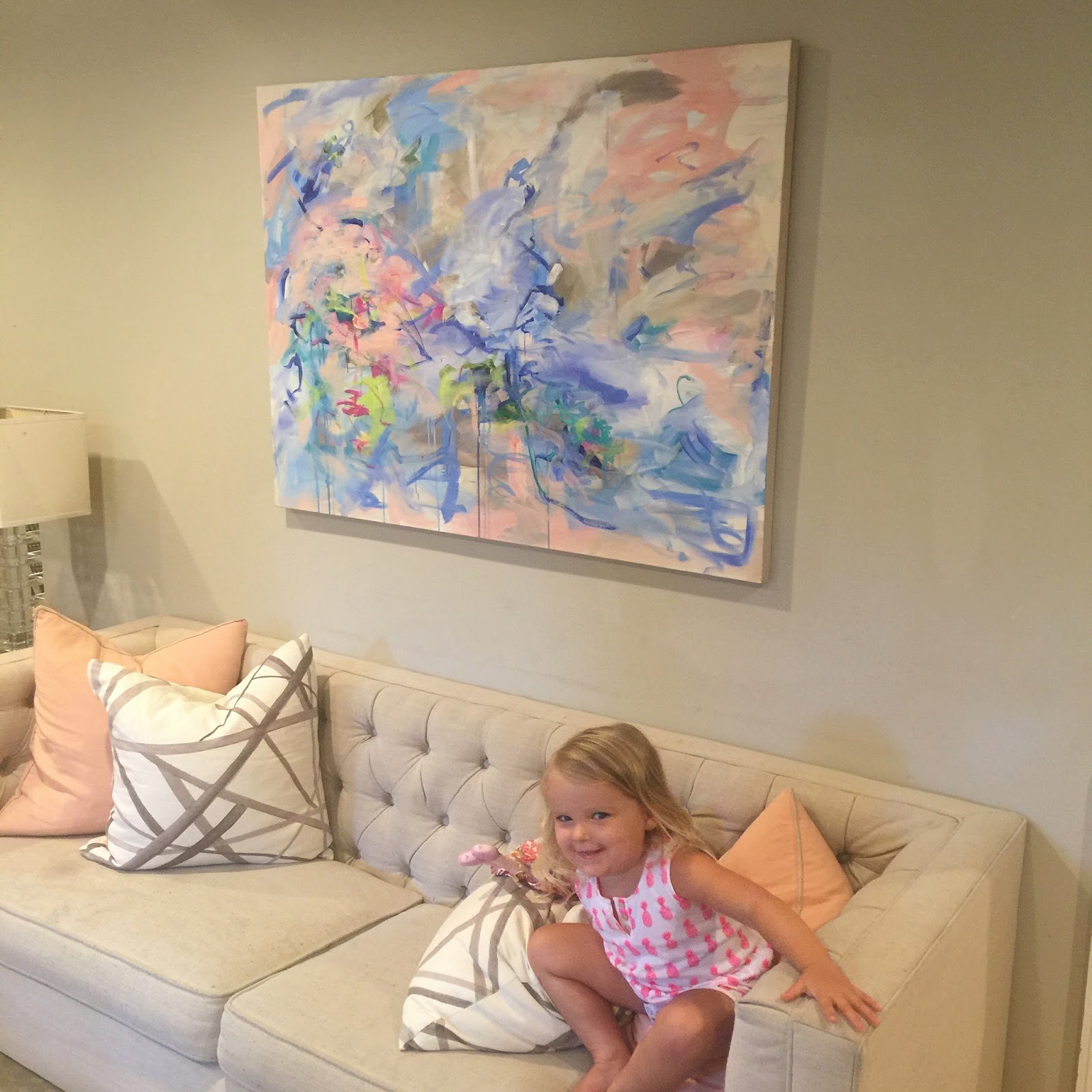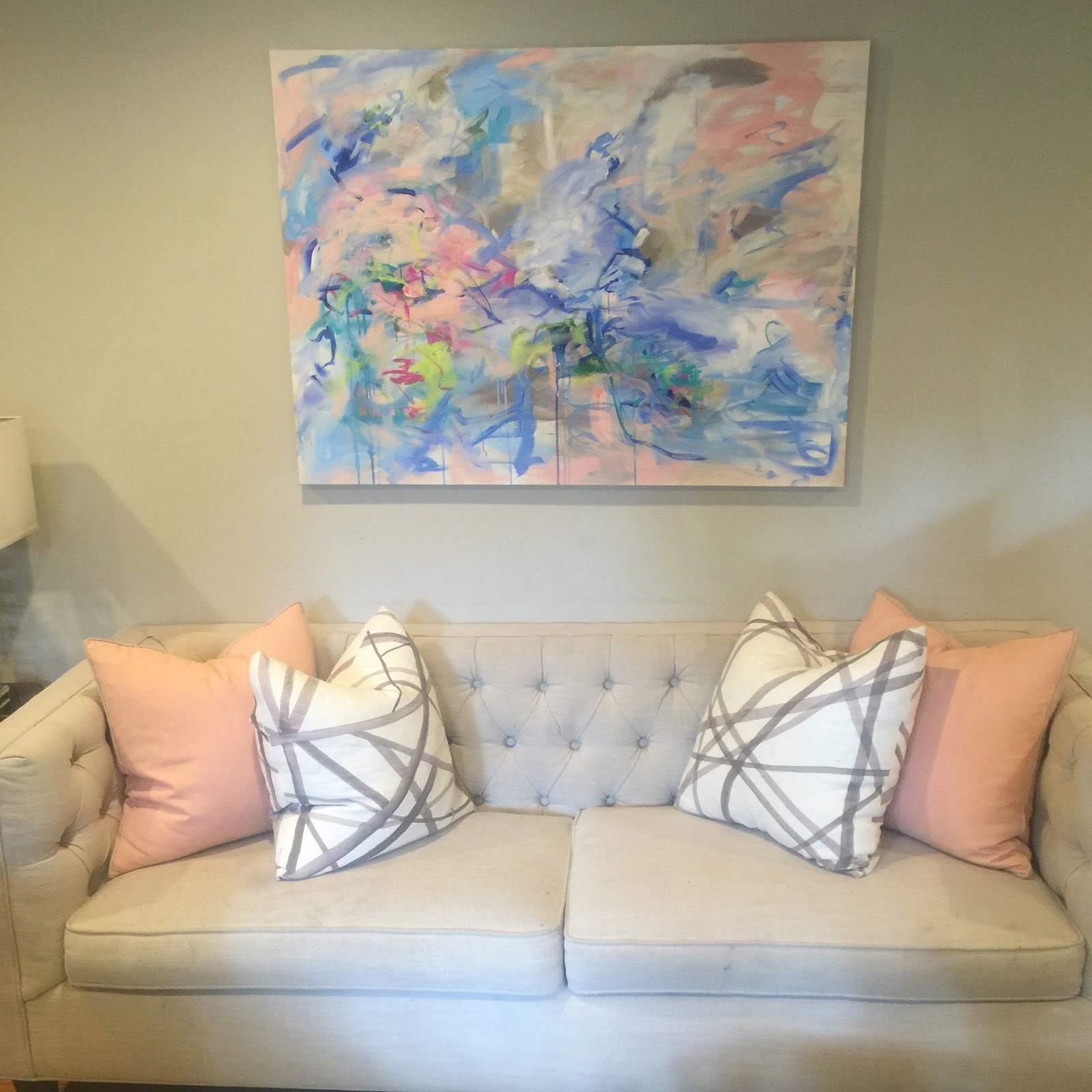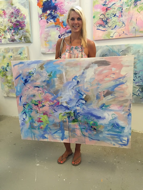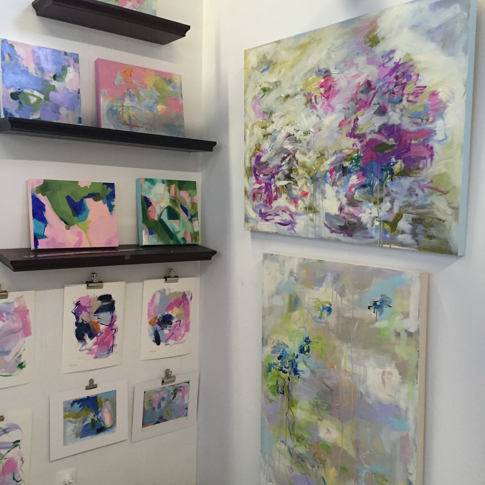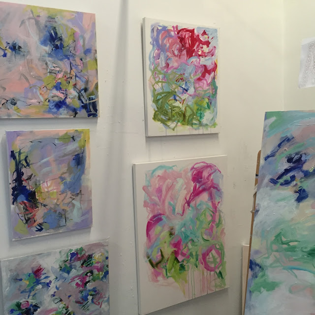 I stopped by her studio at Redux a few weeks ago to chat and pick up a commissioned piece she did for us. I was blown away by all her current work. I snapped a few pictures while I was in her studio. It was so cool to see where she works. I was really drawn to her current color palette. I love the pinks and blues.