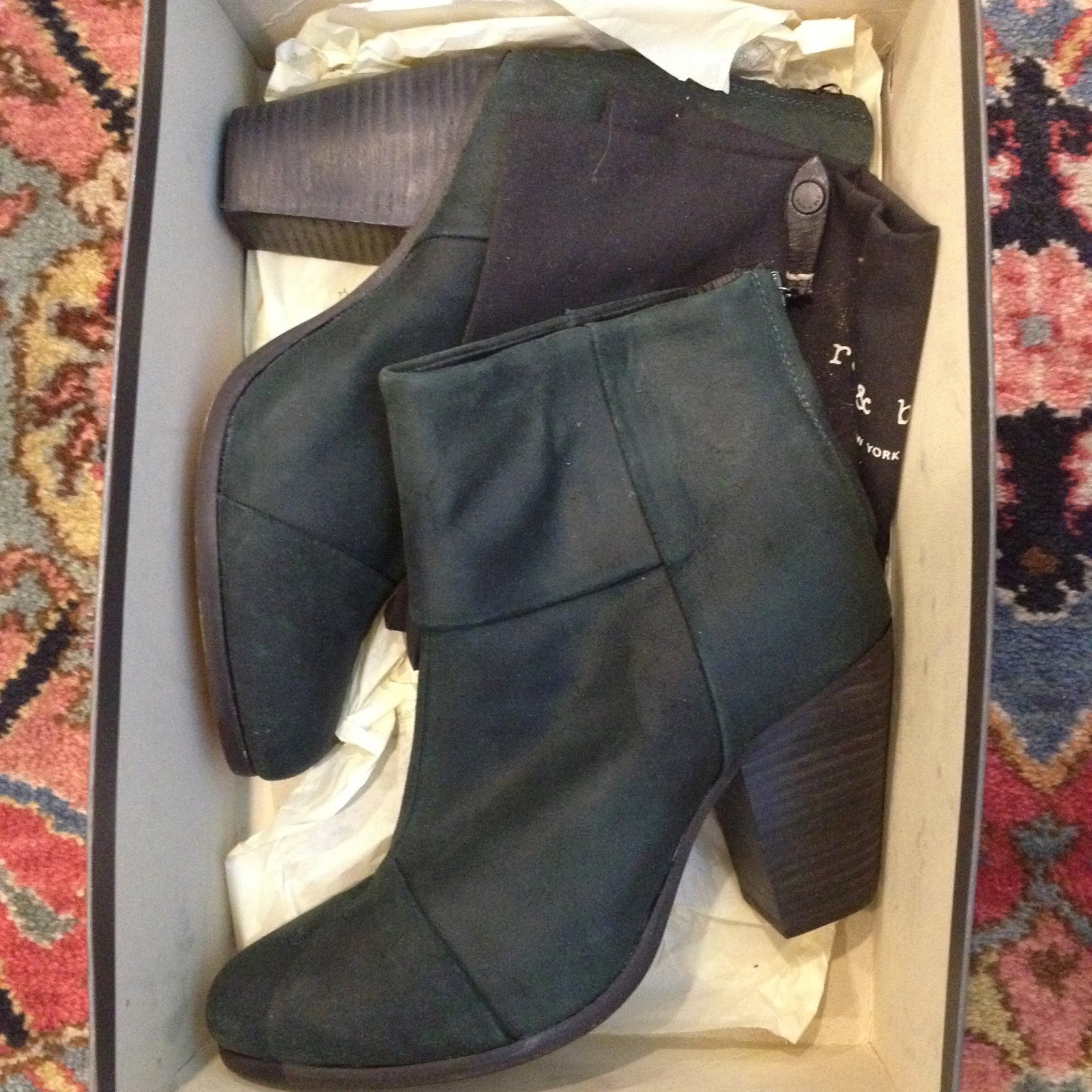 Long story short these were my first pair of Newbury booties but I bought them too small and could not return. Gave them to my sister but they were too small for her too so they are now up for grabs. They have never been worn and are brand new. The color is a dark hunter green but they honestly look black in most lights.