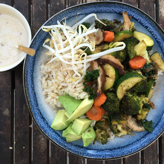 Transfer the brown rice to bowls. Top with the cooked vegetables, diced avocado and bean sprouts. Drizzle with the Lemon Tahini Dressing.