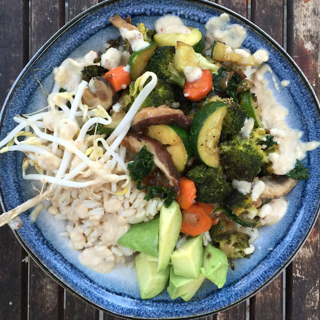 If you are anything like me then you needed a few detox meals after the holiday week. I did my fair share of over indulging and not exercising last week, so it was time to get back on track. I was feeling sluggish and bloated and knew I needed some healthy meals to make me feel better. This is a great way to get your fill of veggies and it is easy to make ahead of time. You can cook the brown rice and veggies ahead of time and just store in separate containers until ready to use. The dressing is the best part. You really could use any type of dressing over these bowls but I love the creaminess the tahini brings, the tartness of the lemon and the spice of the red pepper flakes. It is a great combo!