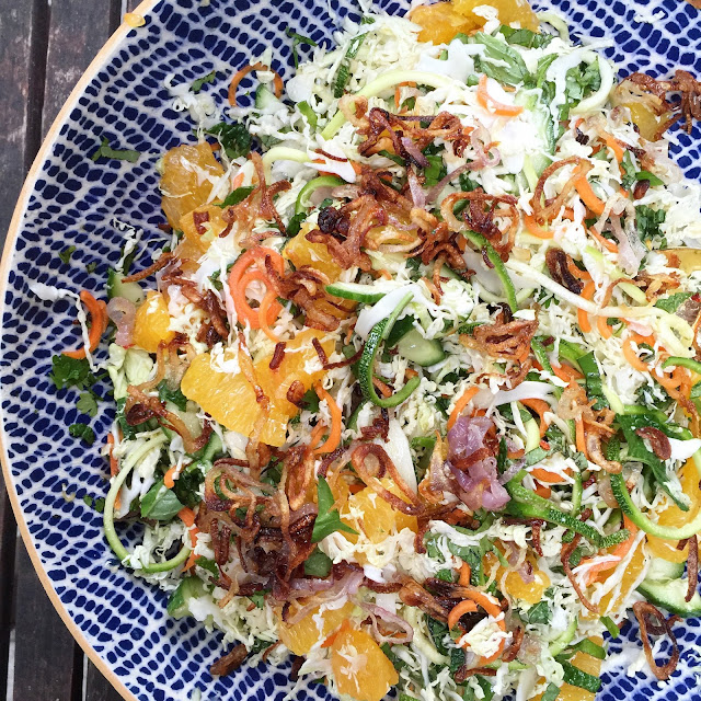 This salad is a little different. but my spin on their salad. The Siam has peanuts and avocado which would be great added in here but wouldn’t you know it my avocados were rotten when I opened them and we had no nuts. Add them if you wish. I added the spiralized zucchini and carrots because I love spiralizing things and had a few on hand from our Farmer’s Market trip. I like the combo of the spiraled veggies and shredded cabbage. The fresh herbs and crispy shallots make this salad amazing and take it to the next level. I want to put crispy shallots on everything.