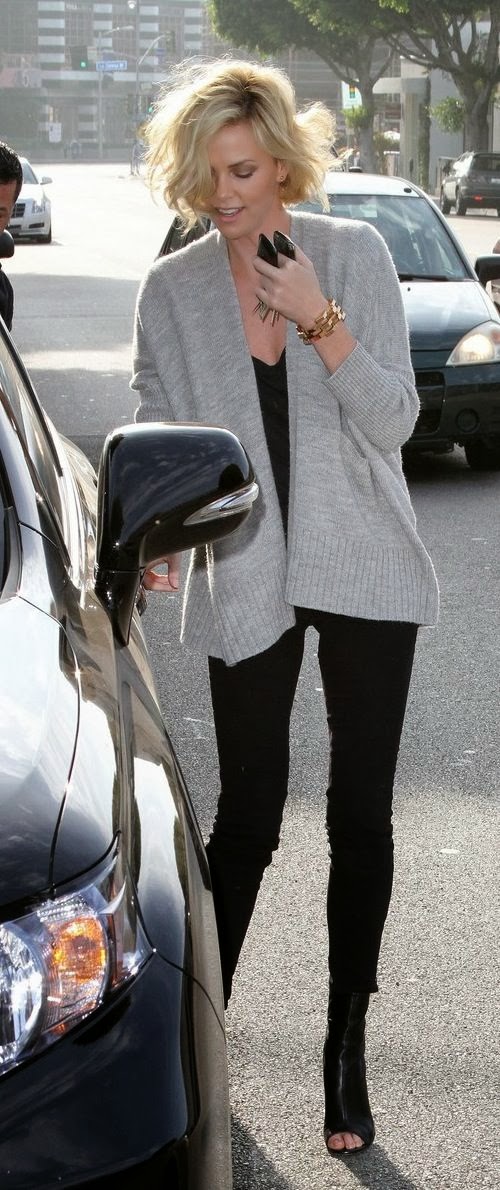 Also love this pic of Charlize Theron for inspiration. Leggings and sweaters can be a chic look!