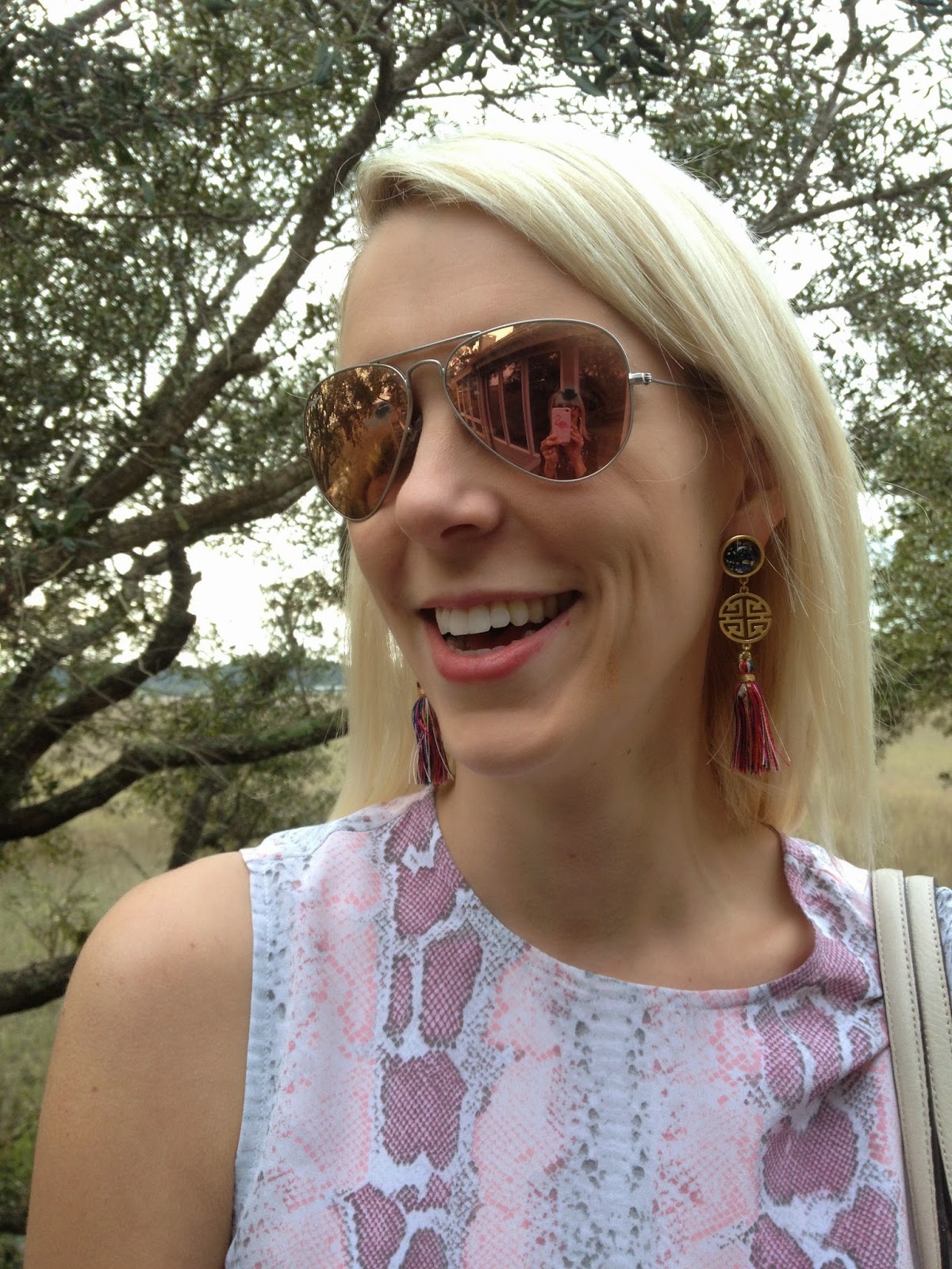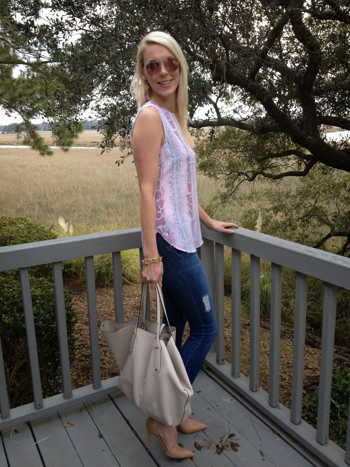 Snakeskin Top (also in blue) |Jeans | Purse | Shoes (similar) | Sunglasses