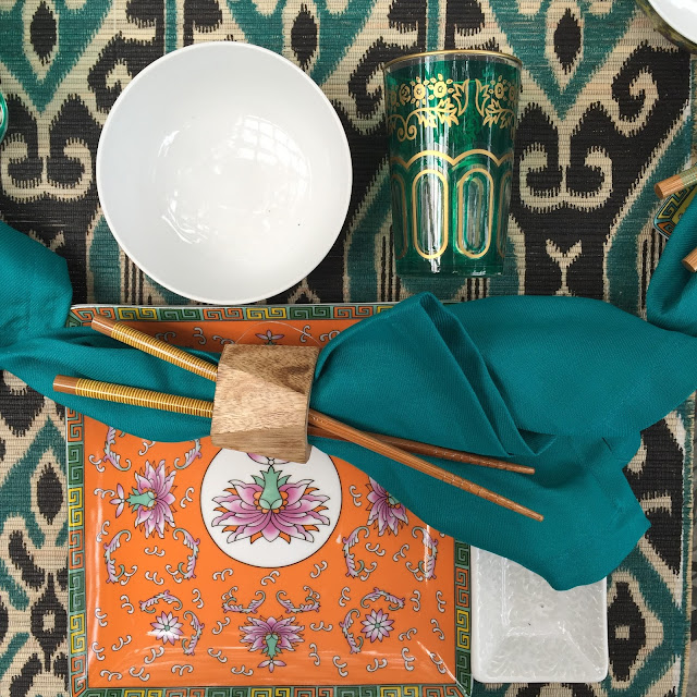 Square Shanghai Plates | Table Runner | Napkin Rings | Napkins | Shanghai Bowls | Moroccan Tea Glasses | Chopsticks | Sushi Dipping Dish