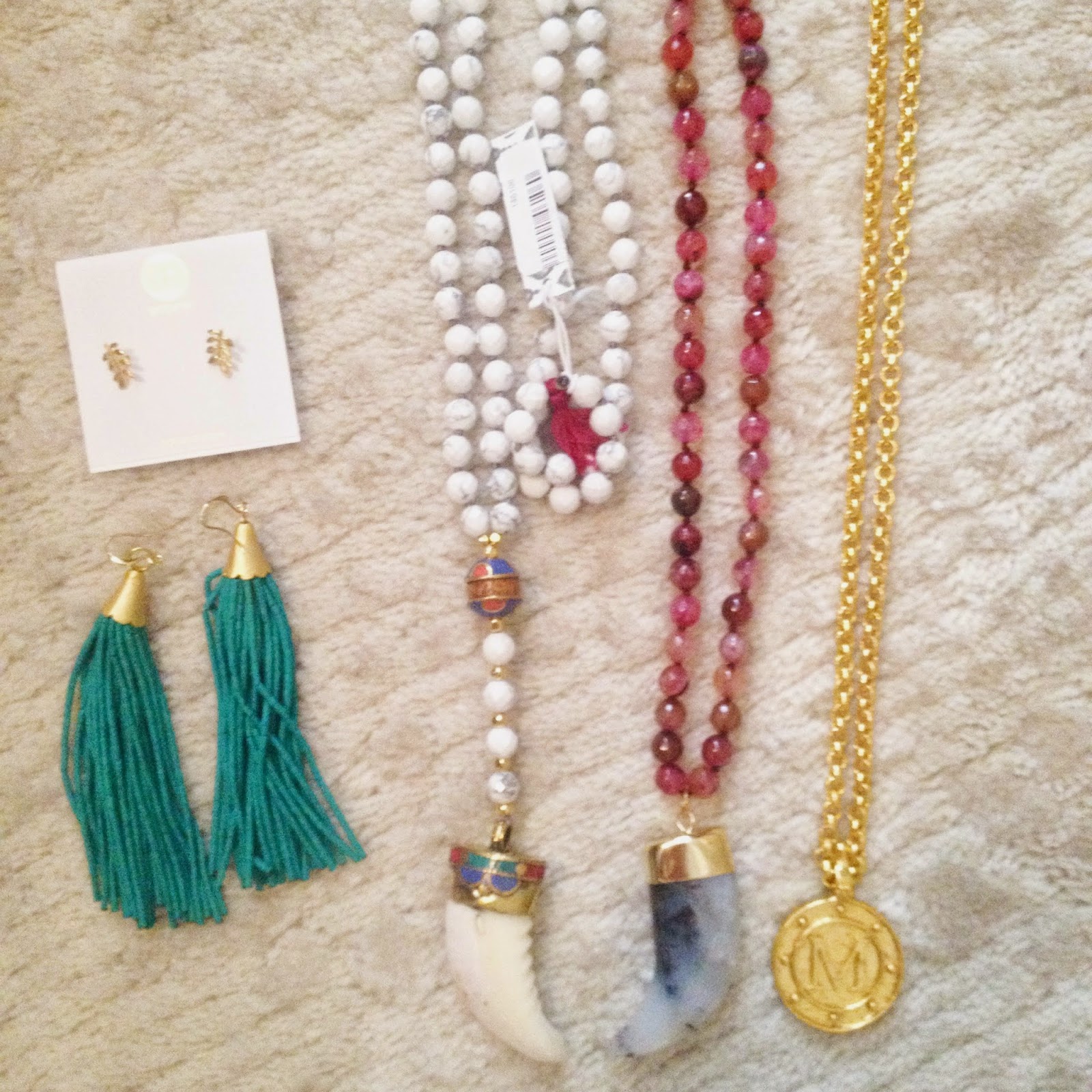 Jewelry | I loved all the jewelry in this month’s box. I ended up keeping the tassel earrings and the pink horn necklace.
