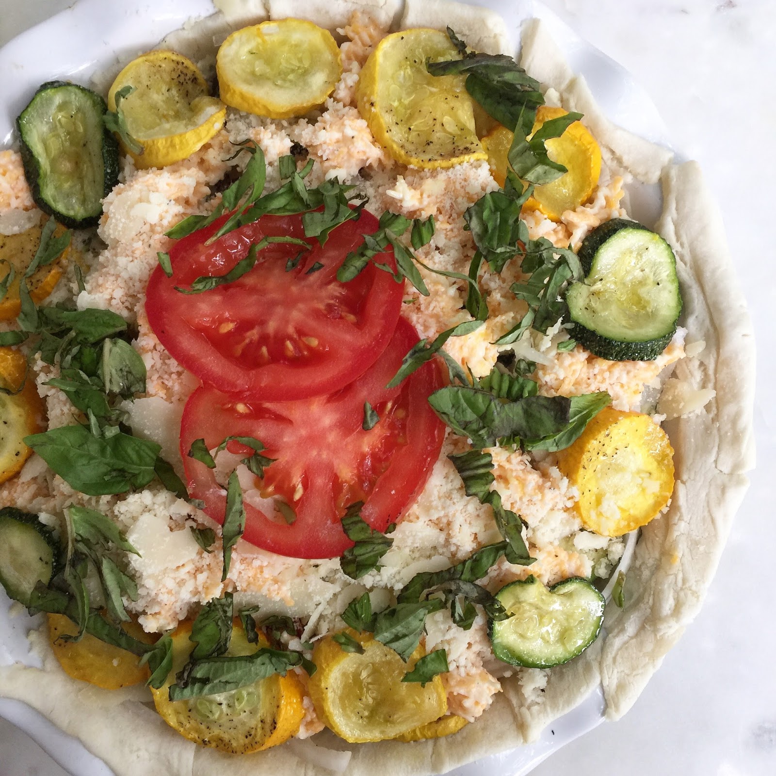 This little delicious pie is like Tomato Pie but better. Matt and I both agreed that we loved the addition of the squash and zucchini. It has been on repeat around here lately. The roasted veggies give the pie so much extra flavor. This is such a great way to use up extra veggies and tomatoes that are so abundant right now. You can easily make this ahead of time and just let it sit in your fridge til you are ready to bake it. Keep an eye on the pie crust as it bakes because it has a tendency to burn. If it does I sometimes cover it with foil. Let the pie sit about 10-15 minutes before slicing it or it will be super messy.