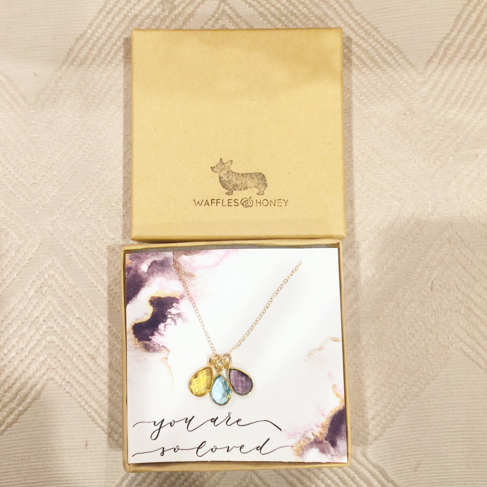 Lastly, my friend Karina from Waffles and Honey has put together the most beautiful gift boxes and they are only $49. You can custom create and pick what stones you want in the necklace. I was just gonna do the kid’s birthstones but I liked the idea of three stones so I added mine in too. I love the result. I did my necklace in gold because that is all I wear but you can also make it in silver as well. She also does birthstone earrings. These make such a special and thoughtful gift.