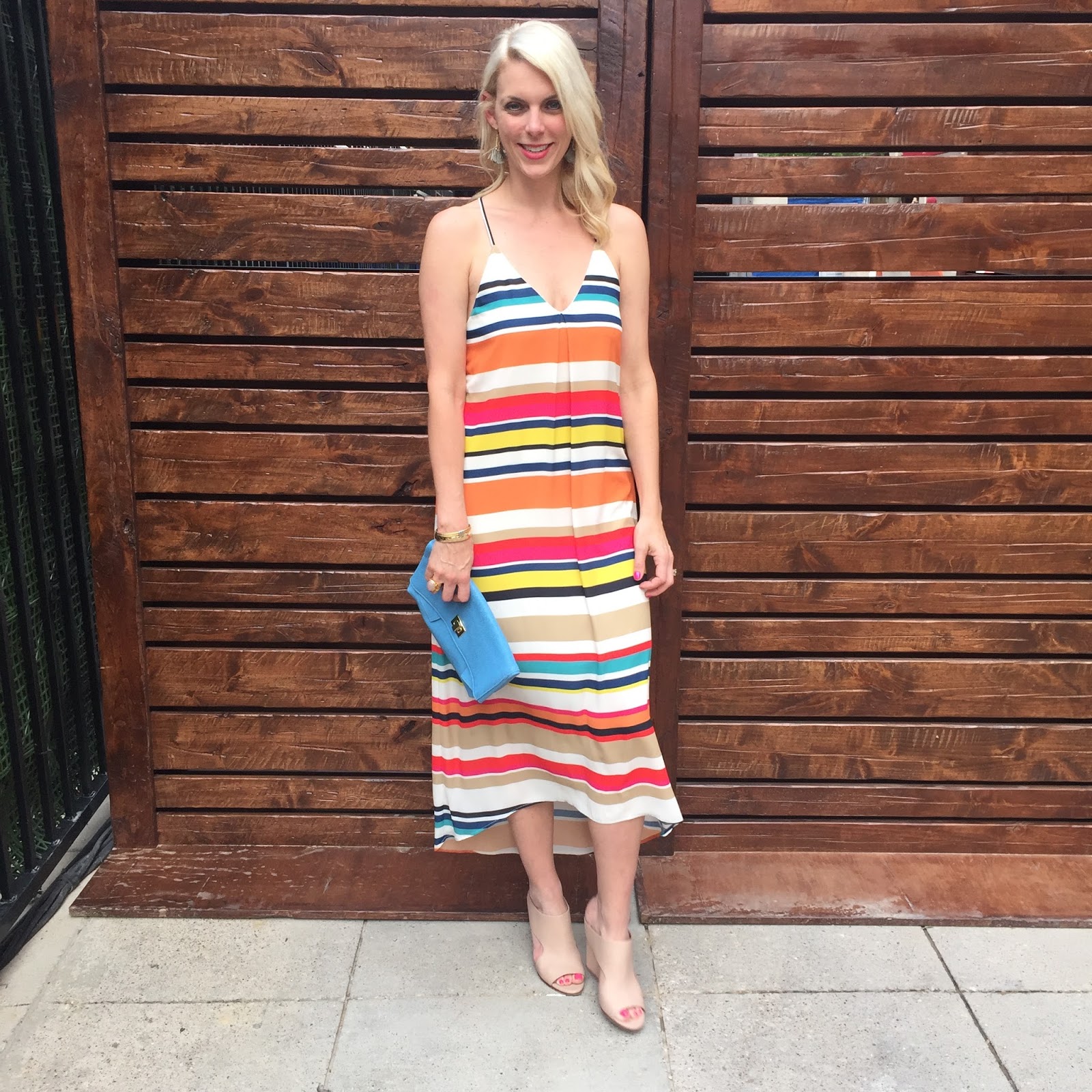 It is fully lined and I really like the cut of the dress and the bright stripes. It looks great with wedges, flats or heels if you want a dressier look.