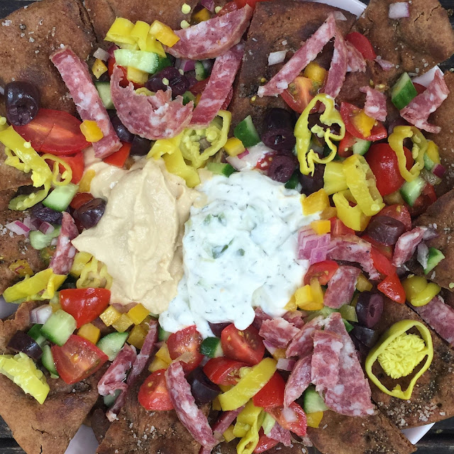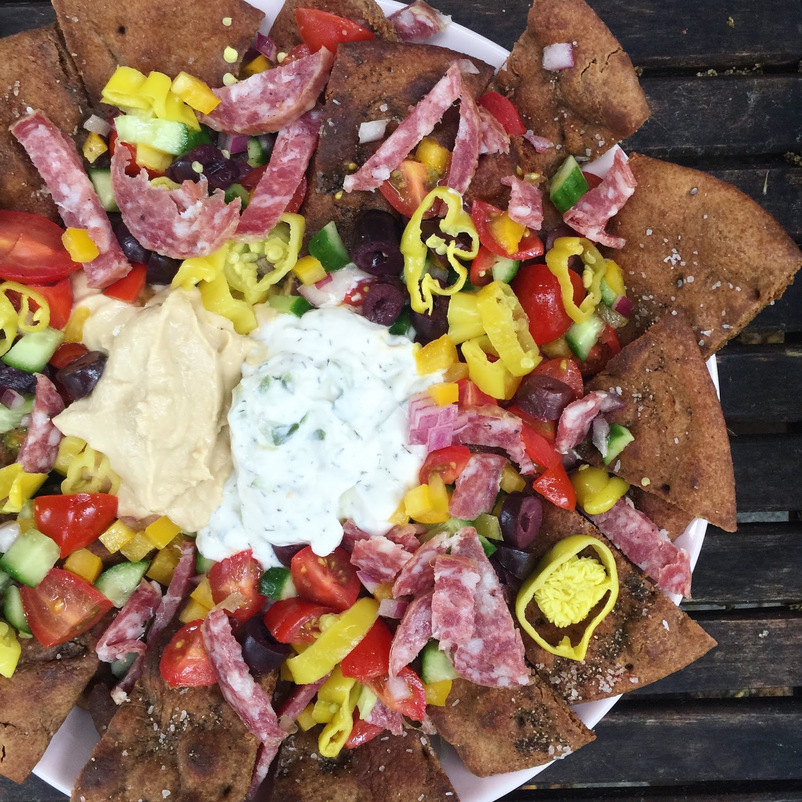 Where have these nachos been all my life?? You see I love nachos but I have only really had the traditional kind piled high with Mexican goodness. These nachos are different, healthy actually and so amazing. Perfect for lunch, dinner or an appetizer. I made my own pita chips by toasting the bread with oil and spices and they really take these nachos to the next level. But if you are feeling lazy and want to skip a step store bought pita chips would work just fine. I had all intentions of adding feta to this recipe but forgot, so add that on top if you want. I think the feta would provide a nice creaminess with a slight salty edge. I used soppressata as the meat on these because I had some left over but you could really use any type of salami, shredded chicken, or no meat at all. These are best served right after you make them because the nachos will get get soggy the longer they sit.