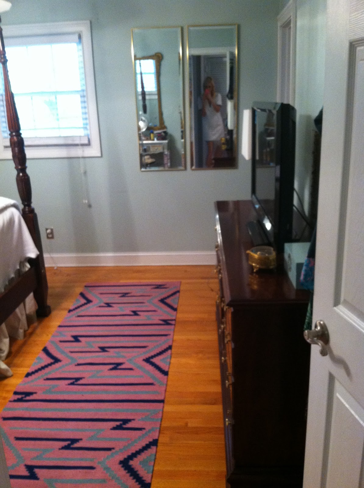 In case you noticed in the previous picture, I moved my Lulu and Georgia Runner to our bedroom. I put my sweet dad to work while he was in town helping me rearrange stuff. We also hung this vintage mirror from my grandmother and moved our bar area.