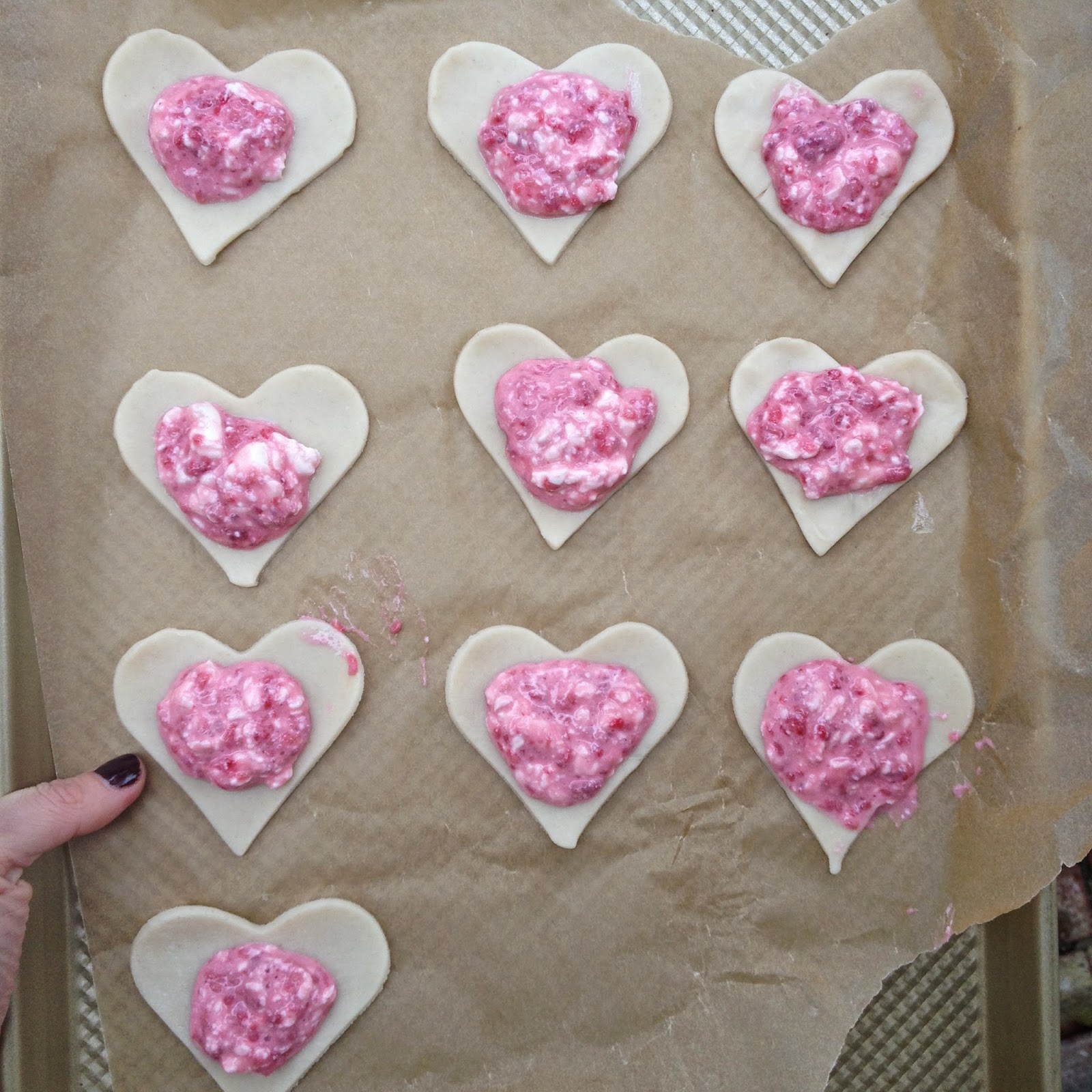 Place half the hearts on a baking sheet lined with parchment paper. scoop a small spoonful of the raspberry mixture in the middle. Place the remaining hearts on top and mash together around the edges with a fork. Then take a toothpick and poke several holes in the middle. Bake at 400 degrees about 20 minutes until they start to slightly brown.