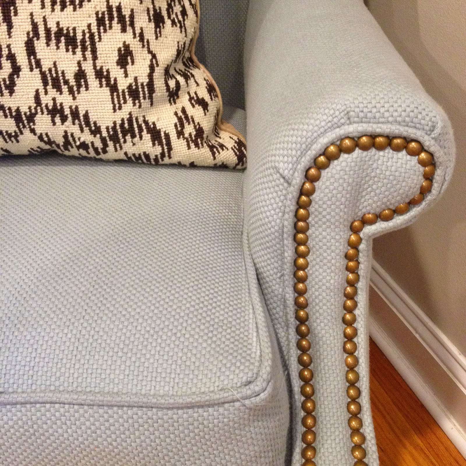 I am so pleased with the results. I worked with GDC Home and was so pleased with the results. I have to say they have such an impressive fabric selection and everyone there was a huge help. If you need fabric it is wonderful because you can take as many samples as you want and even check the whole bolt of fabric out which is what I did. I had originally thought I wanted a pattern and checking out the bolts helped me to realize in the end I wanted a neutral. I tire of things quickly and with a neutral I can easily switch out the pillows. I decided to jazz up the neutral with brass nailheads for a polished look.
