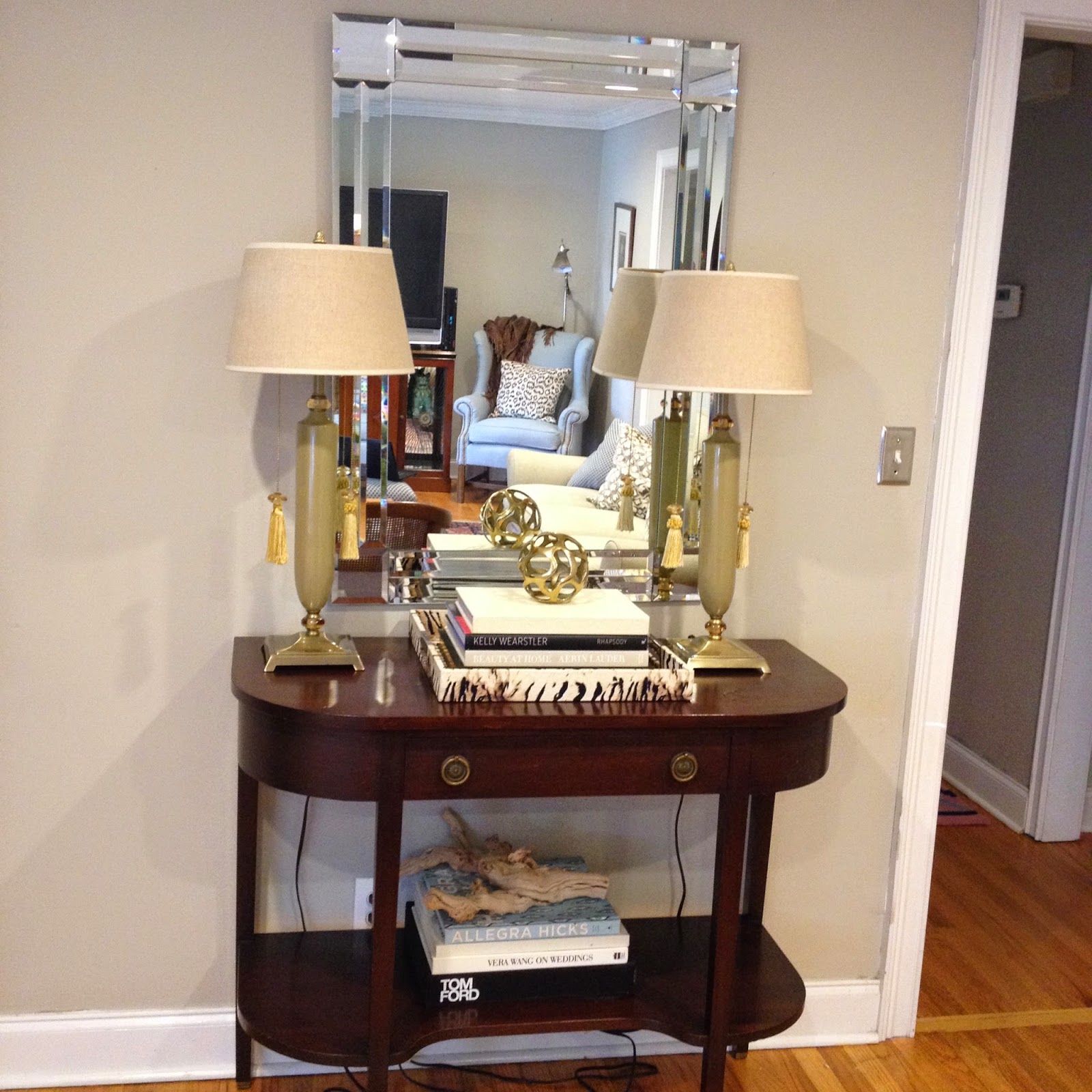 Everything looks fabulous!! I love the newly upholstered wing back chairs. That fabric looks awesome and I love the color. I think for your entry table that you can just use some type of tape to run the cords behind the legs of that table!! I love all the attention to detail and can't wait to see the rest of the house!