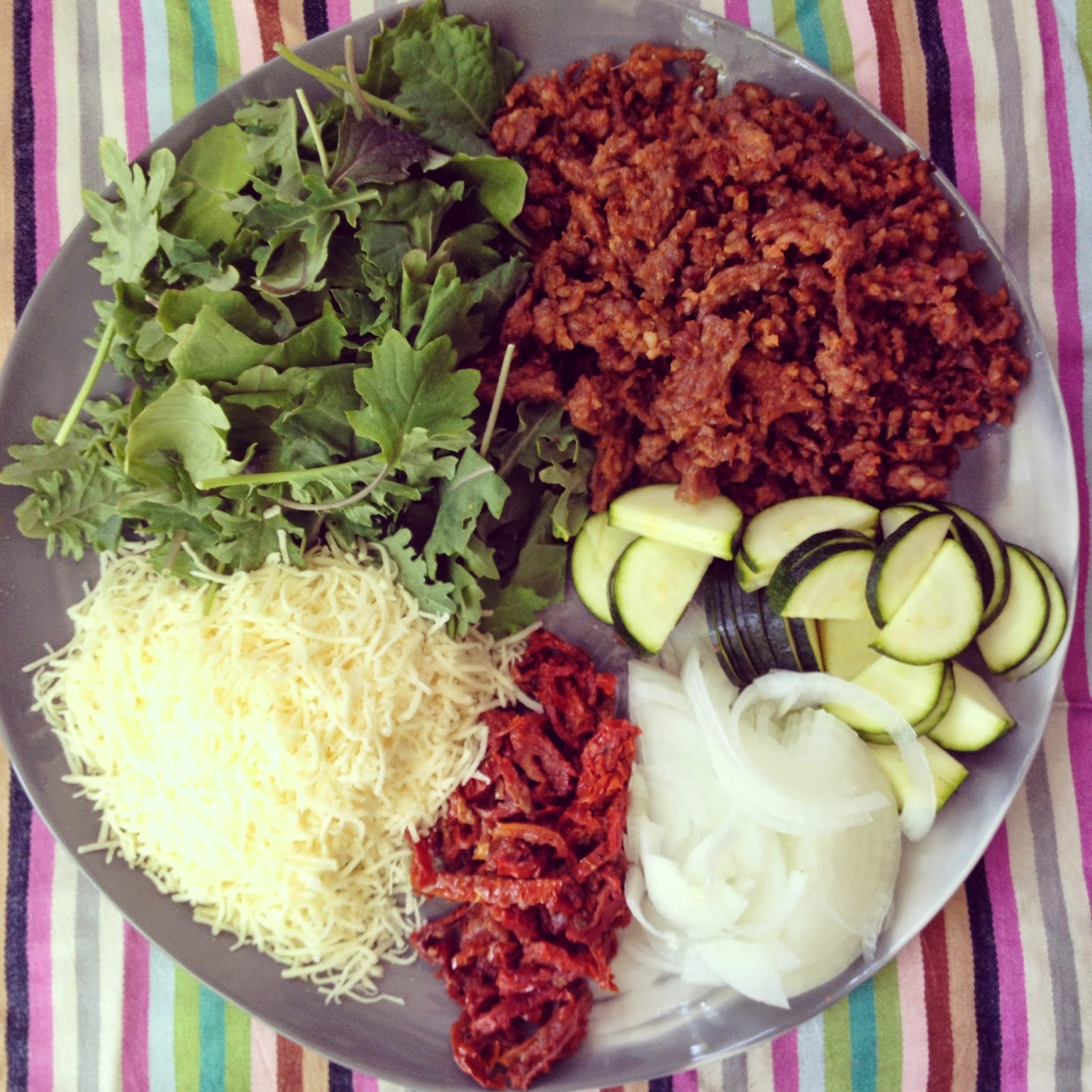 Brown sausage and drain off all fat. I like to place on a plate with paper towels to soak up the grease. In the same pan you cooked the sausage in, add a little olive oil and saute onions and zucchini about 5-7 mins. Then add in kale and sun dried tomatoes, cook just until kale is wilted. Remove from heat and stir in browned sausage. In a separate bowl whisk 6 eggs with flour, baking soda, and salt and pepper. Stir in sausage mixture until combined well. Finally stir in cheese. Pour mixture into cooled pie crust. Bake at 350 degrees about 30-40 minutes. This can be made ahead and save well in the fridge foe a few days.