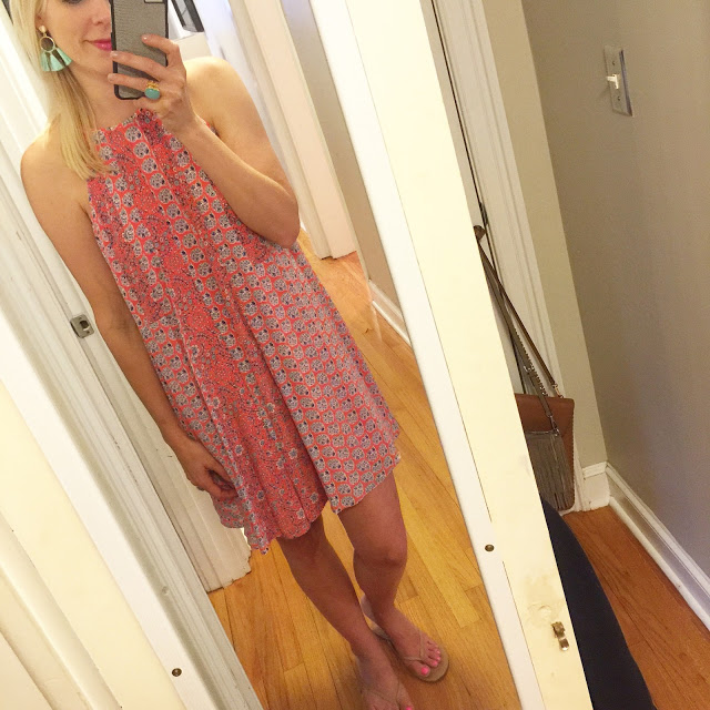It seems to run pretty TTS, maybe a touch on the large side. This would be a great dress for any of you pregnant friends because it is very loose. I always liked not buying maternity clothes when I was pregnant so I could wear them again afterwards. I am wearing a size 4.
