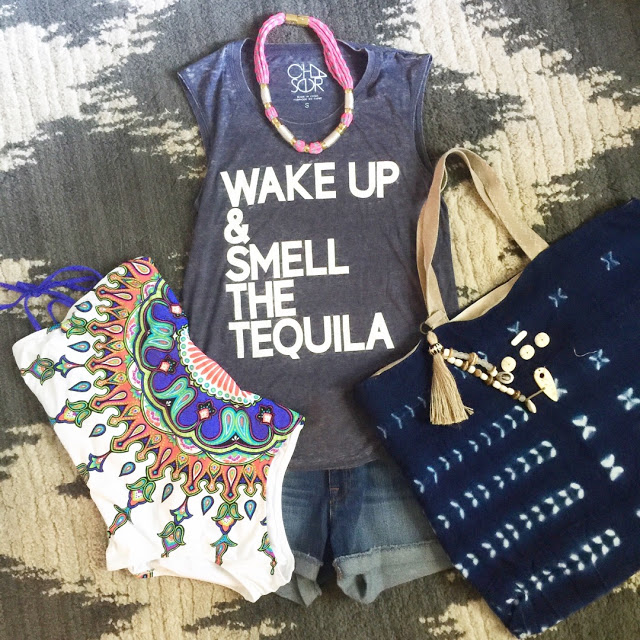 Tee Shirt + Bathing Suit + Necklace (available at Beckett Boutique in town)+ Shorts + Tote
