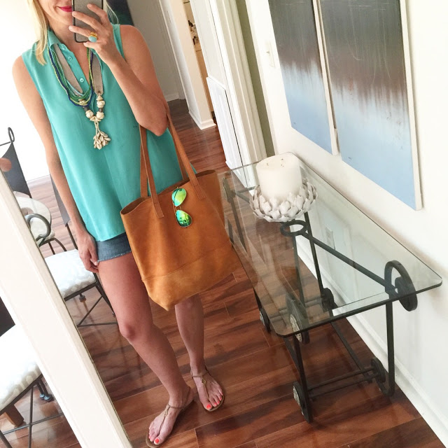 Blouse (50% off) | Necklace | Purse | Sunglasses | Jean Shorts | Sandals
