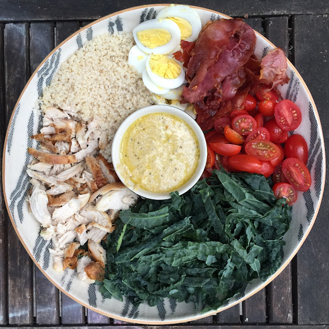 Arrange all salad ingredients in a bowl. I like to keep my ingredients separate because I feel like it makes the leftovers less soggy. Scoop a little of each ingredient in a bowl, top with crumbled prosciutto and drizzle with dressing.