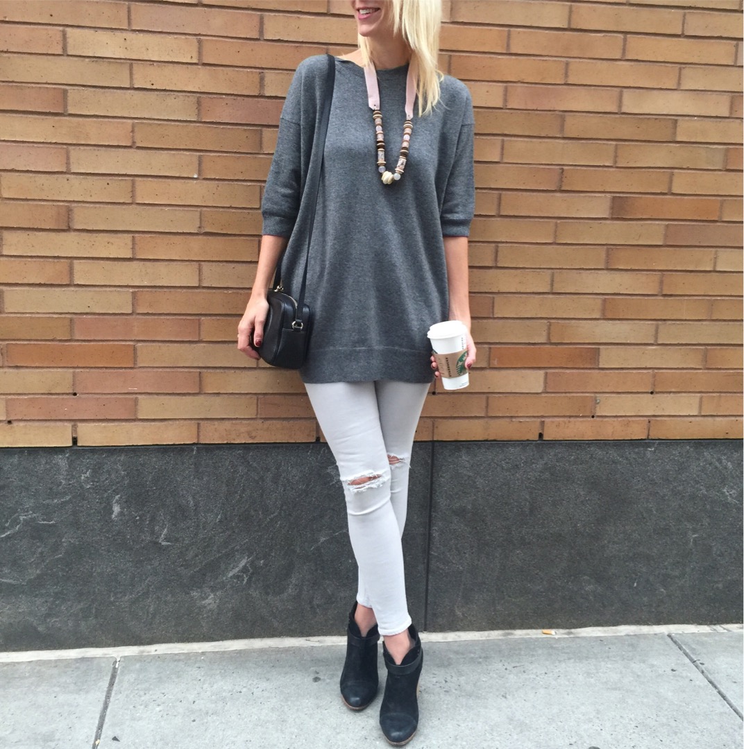 I own this Vince sweater in the gray. I wore it last week while I was in NYC. I like the fact that it has short sleeves and is a lighter weight knit. Added bonus it is so soft!!