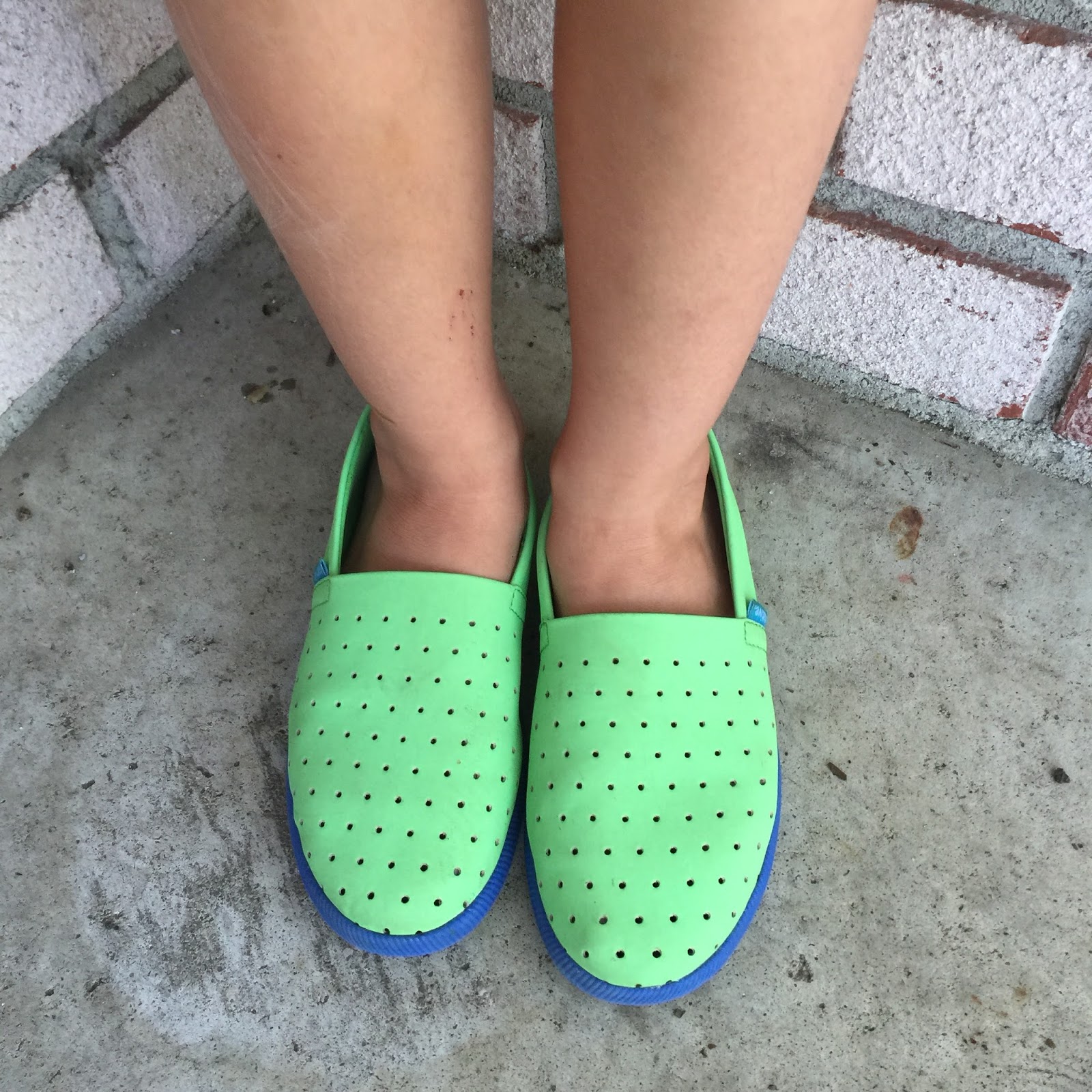 It is hard to tell in the pic but they are wearing the new Native Shoes called The Venice. These are a bit different from the regular natives. They are made out of a thiner light weight material almost like neoprene. The kids love them. They are so easy to get on and clean as well. Sterling has them in the blue color and green, and of course Frances wanted pink.
