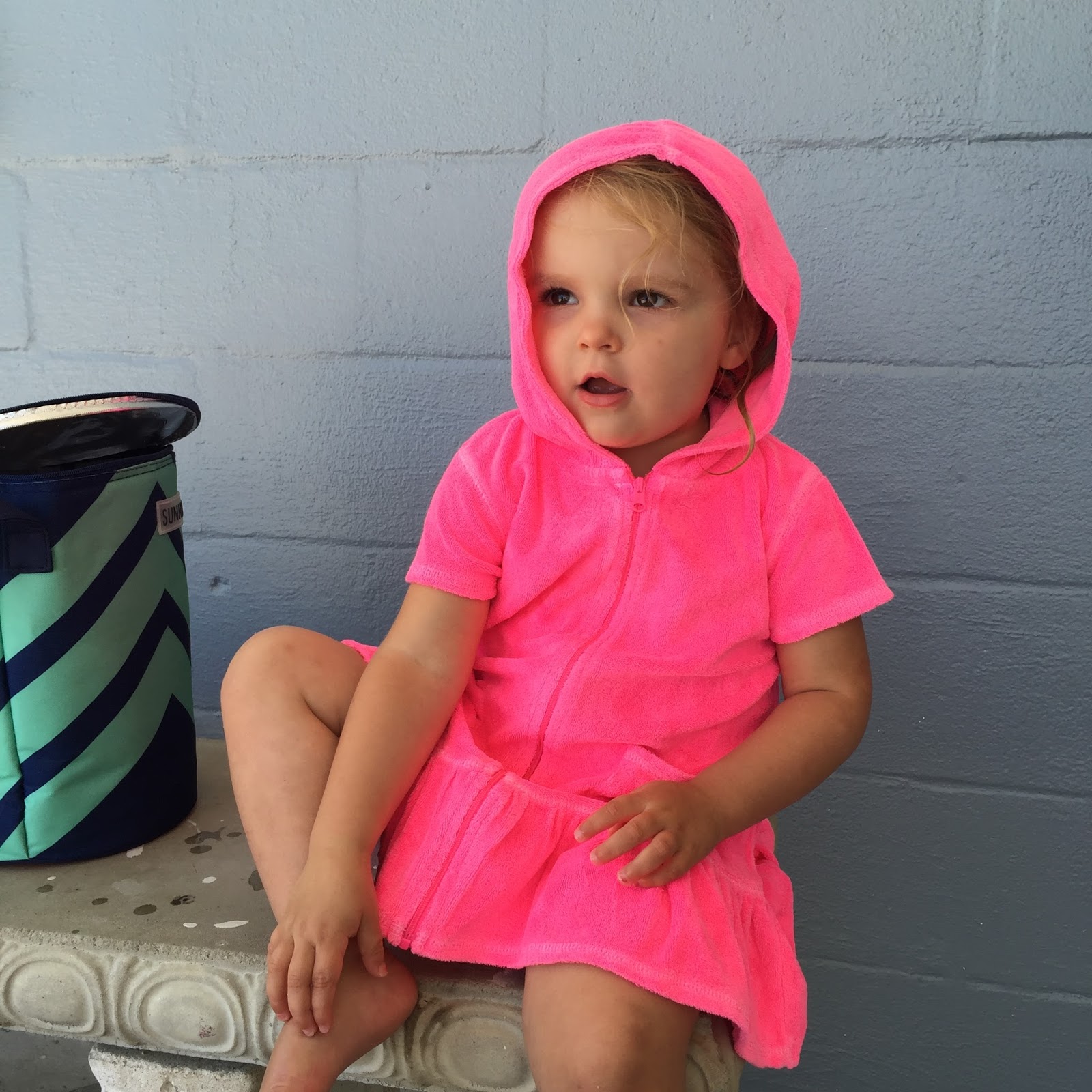 We also really like this zip-up cover for Frances Moon. It is the perfect shade of hot pink. It is nice that it zips up and she can put it on herself. Plus it is made of terry cloth so it acts as a towel too drying her off.