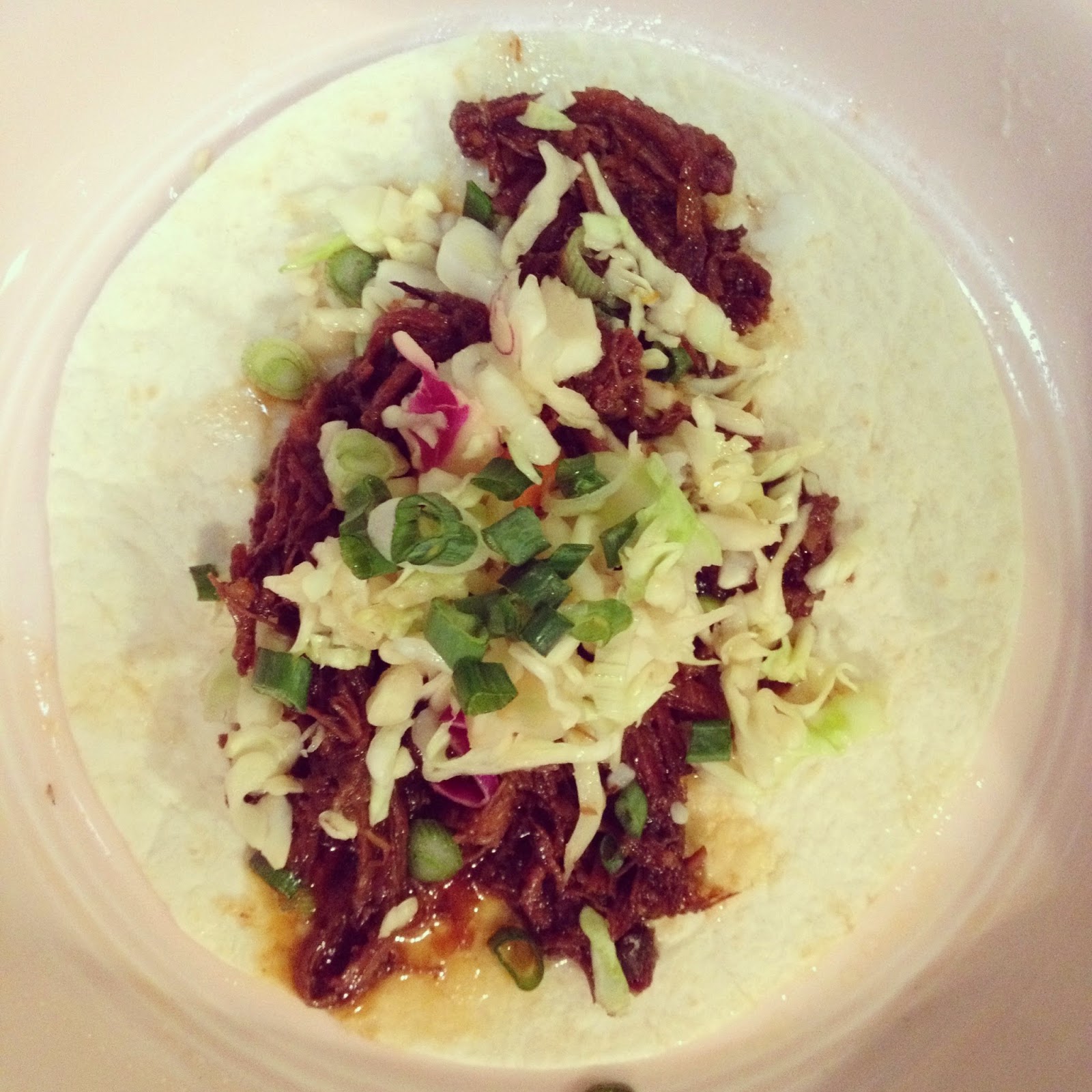 shredded. Turn the meat over a few times during the 8 hours. At about hour 7 I took a fork and started shredding the beef and removing any excess large pieces of fat. Let cook for the last hour shredded to soak up the sauce! Serve in soft corn or flour tortillas. Top with shredded cabbage slaw and green onions.