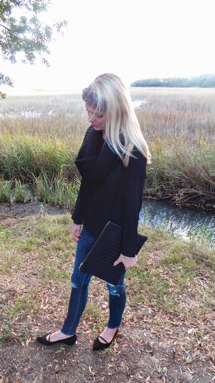 The black scarf I am wearing is the perfect basic black scarf. It just got reduced and is only $17!! I like how chunky it is and so cozy! It honestly goes with any outfit!