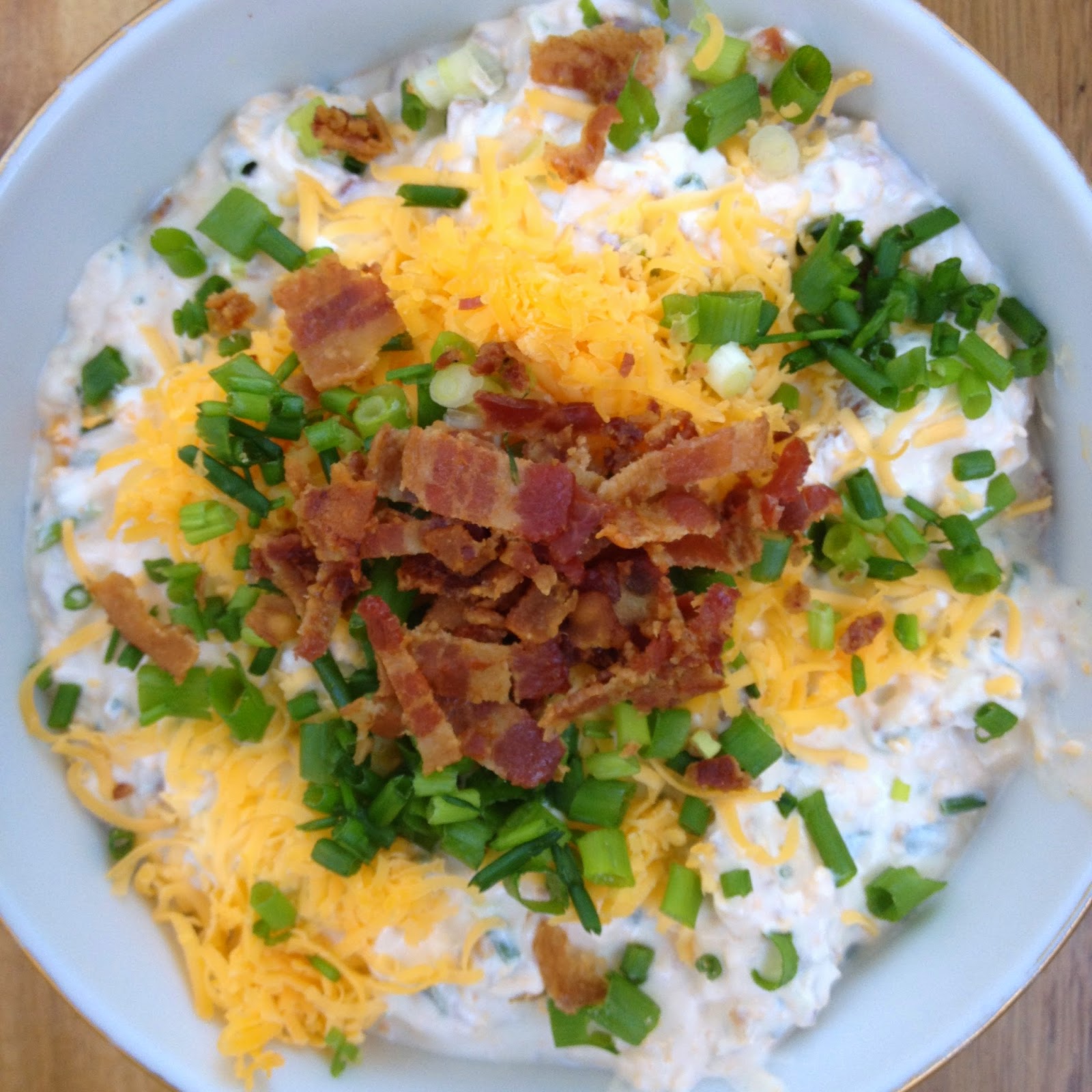 Mix all ingredients together, save a little bit of the bacon, cheese, chives, and onions to garnish with. Best if it can sit in the fridge a few hours before you serve it.