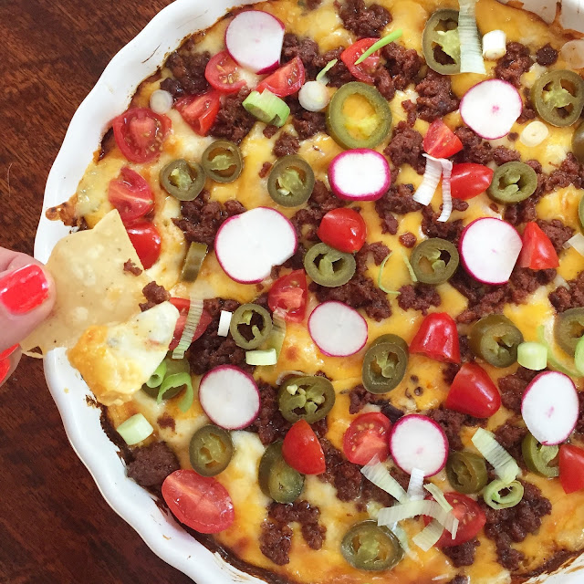 It’s Wednesday and that means Taco Night in the Mason house. My favorite night of the week. This dip would be the perfect starter for Taco Night. It could not be easier to make. But beware you will want to eat it with a spoon. At least we all did last week. We made this while I was home visiting my parents and it was a huge hit. The two cheeses and chorizo combo is killer. Add whatever toppings you like but the cheese and meat are the real stars. I do recommend pickled or fresh jalapenos because they add great flavor and heat. The longer this sits out it does tend to thicken up like any cheese dip so just reheat or use a spoon.