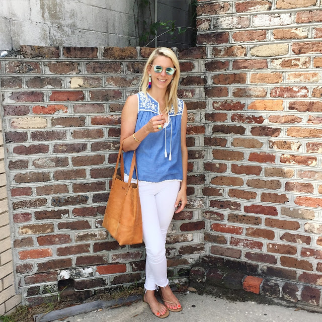 Blouse | Sunglasses | Earrings | Tote | Jeans | Flip Flops | Bracelet
