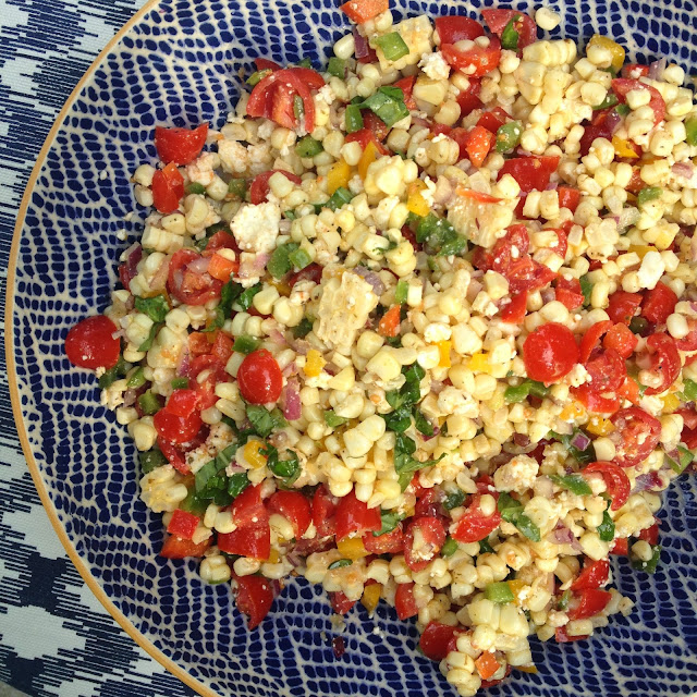 The corn salad recipe is from my dear friend Val’s blog. It is so light and fresh! It saves well too, you can make this a day ahead- but it is best at room temperature. I left out the avocado because we were having guacamole.