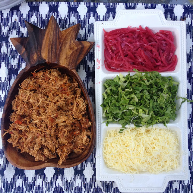 I decided to cook beef and chicken tacos for the main dish. Matt cooks the perfect ground beef taco so I let him handle the beef. I found the chicken recipe on Pinterest. I wanted a crock pot one that could cook all day and simmer. It was so simple and delicious. I served the tacos with shredded lettuce, shredded Monterrey jack ( I always shred my own) and pickled onions (recipe here)