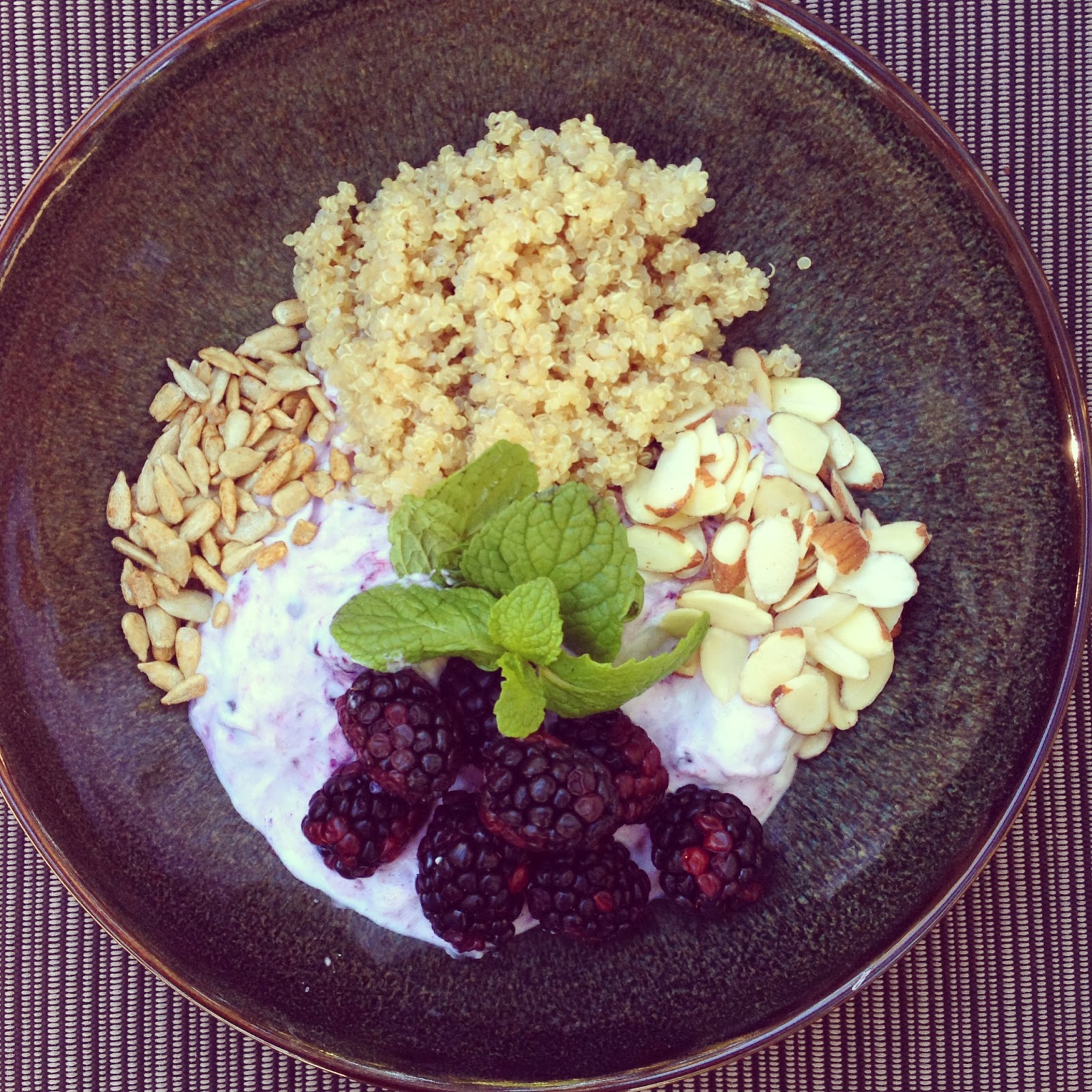 This weekend I tried out a new healthy breakfast. A quinoa yogurt bowl. Basically all I did was smash some blackberries in regular plain Greek Yogurt. Then I topped it with cooked quinoa, slivered almonds, sunflower seeds, fresh blackberries, mint and a drizzle of honey. It was really filling and delicious.