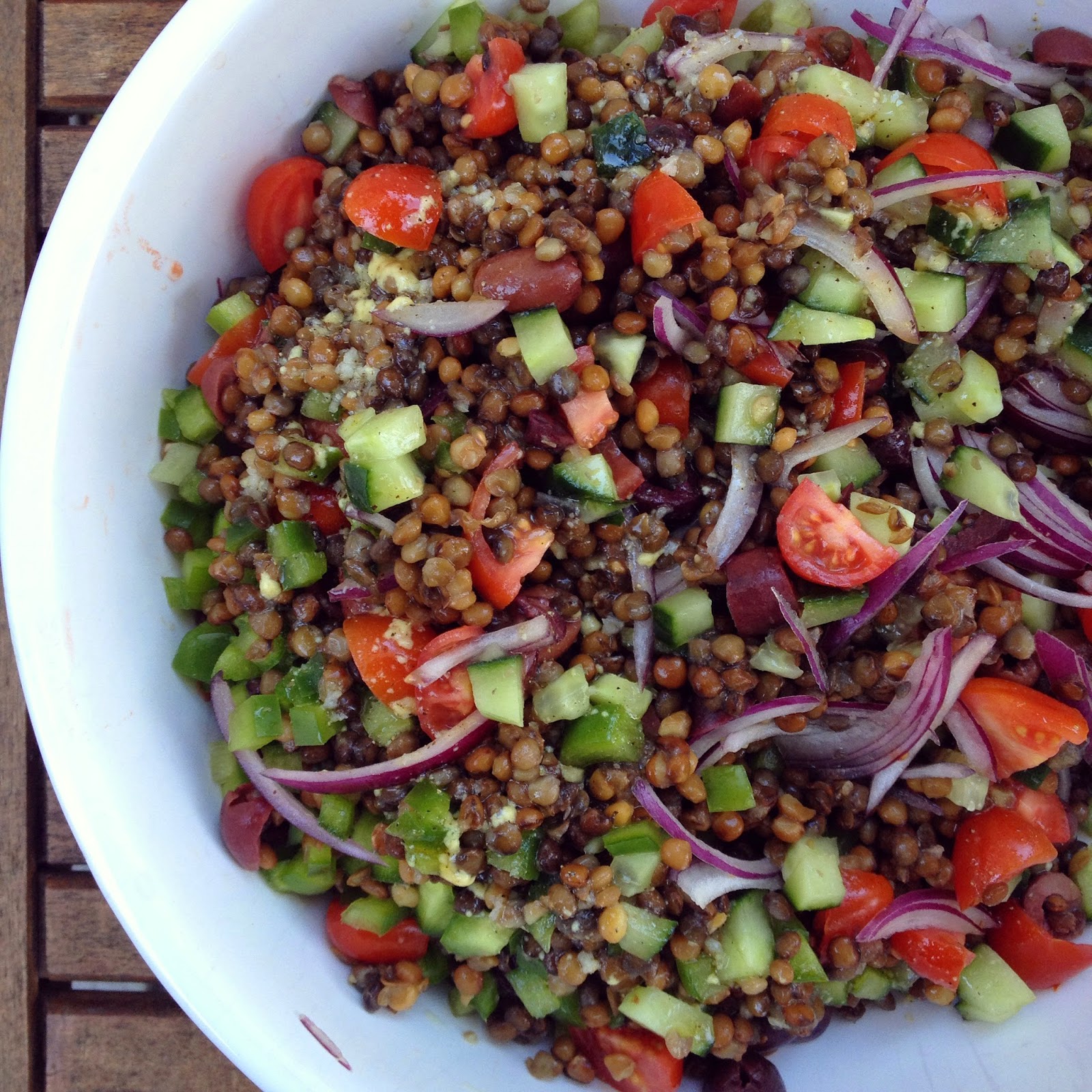 Mix lentils and all ingredients then pour dressing over the top. This can be stored in the fridge for several days but it is best served room temperature.