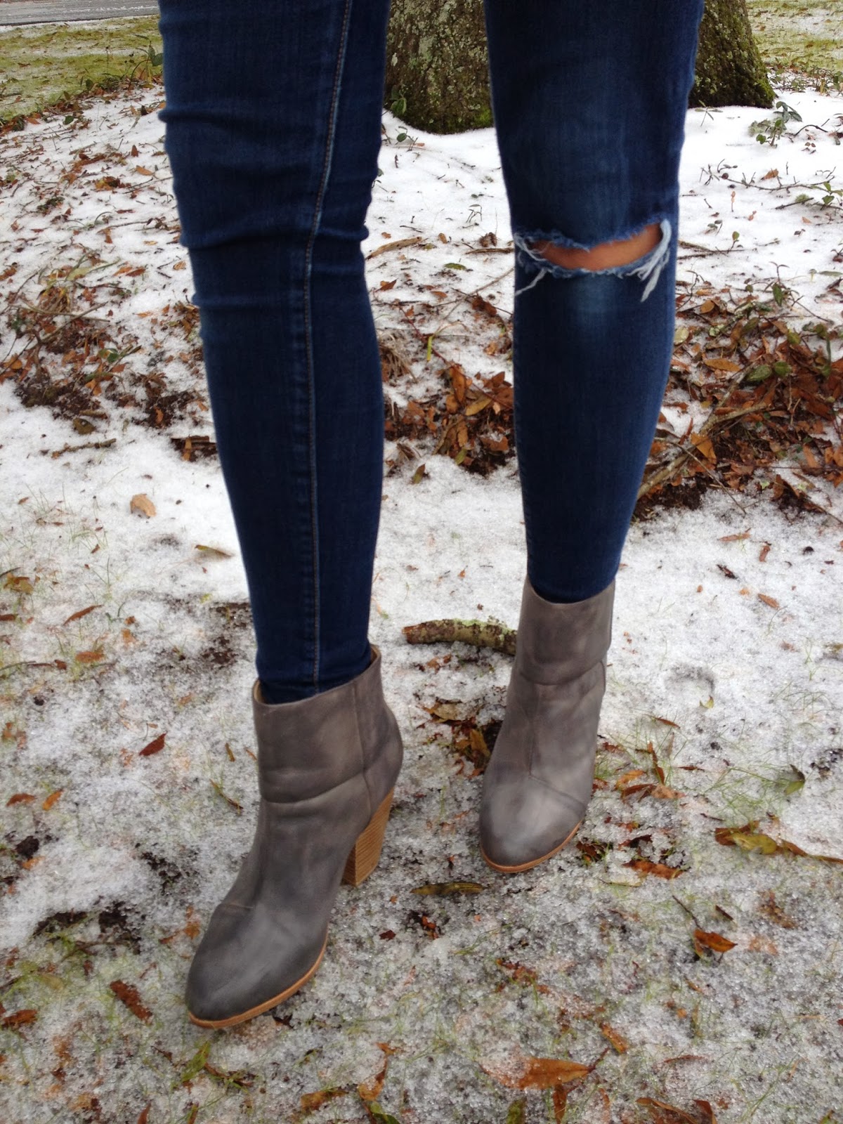 I am wearing the Rag and Bone Newbury Booties in gray and love them! I also have them in dark brown and black. They seriously are my most favorite booties and comfortable too. I can wear them all day with no pain!
