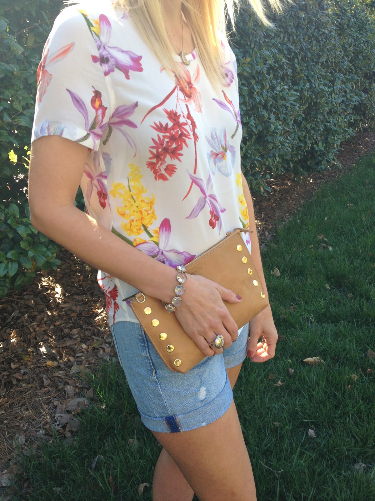 Equipment Blouse (same print different style on major sale ) similar| Madewell Boyfriend Shorts | Hammit Clutch | Isola Sandals |