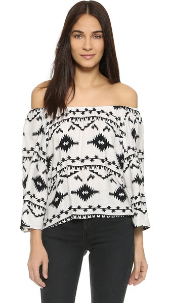 I am still loving the off shoulder look. The black and white pattern on this top makes it pop. Would be cute with jean shorts this summer or colored jeans now. It is priced under $100.