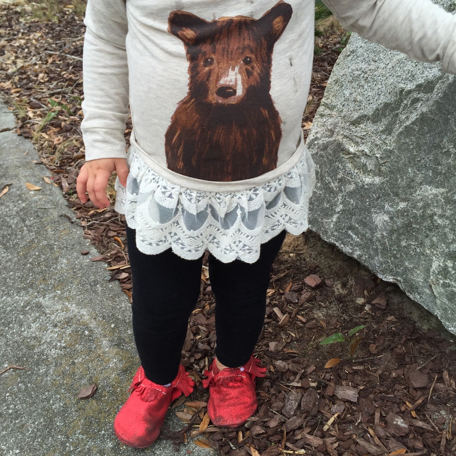 The bear shirt also comes in a Raccoon and Deer Print that are equally as cute:) They run TTS, Frances is wearing a 2T.
