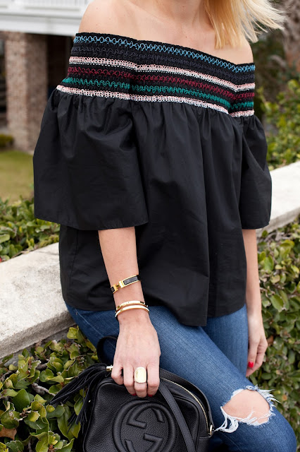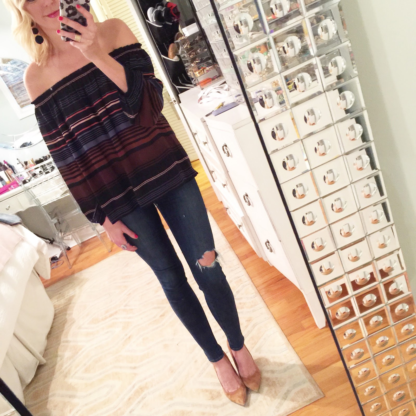 The off shoulder top is one trend I still have not tired of! I own way too many off shoulder tops but they are my go-to for a girl’s night out. I love them paired with jeans and jean shorts!