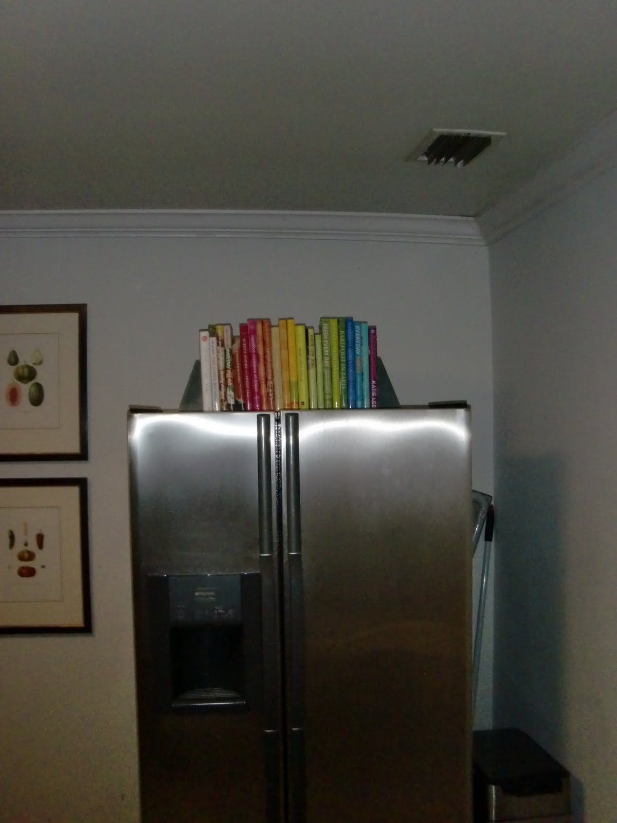 Yesterday after Matt was already at work, I realized my keys were locked in my car. He couldn’t leave work to bring them to me, so I was stranded all day. I was so bored, no trips to the grocery store, Target or any errands. I decided to take advantage of my time while Sterling napped and clean and organize my kitchen. I cleaned out my pantry, polished all the stainless appliances, organized drawers and mopped. A very productive nap time. I was inspired by Megan at Honey Were Home’s bookshelves. They are organized my color and look gorgeous! Unfortunately we don’t have any bookshelves, but I do have an abundance of cookbooks that I decided to organize. I love the result, it makes me happy to look at this rainbow on top of my fridge. If you had seen the top of my fridge before covered with baby food, dog food, cookbooks, jugs of water, etc- this is a huge improvement!