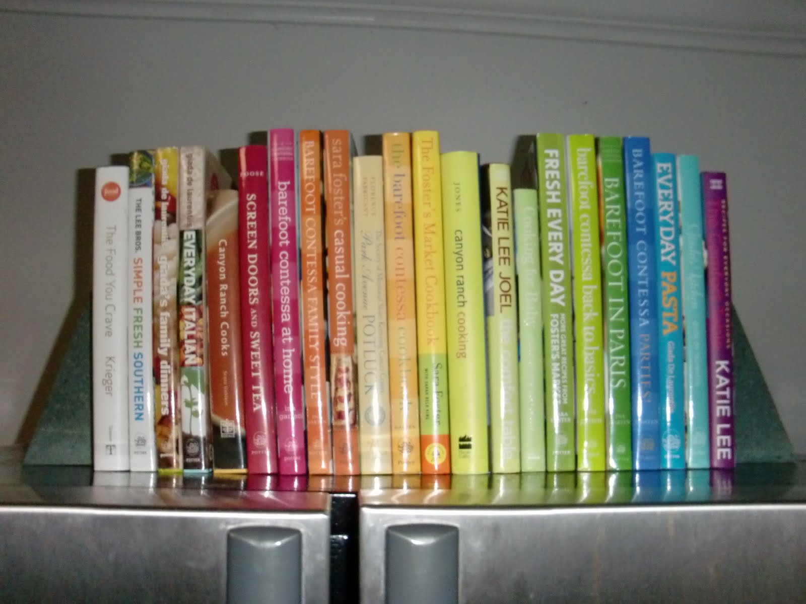 i'm fascinated that you have that many cook books in such a rainbow of colors! i have like 2. one is orange. one is blue. not as much fun as your collection!