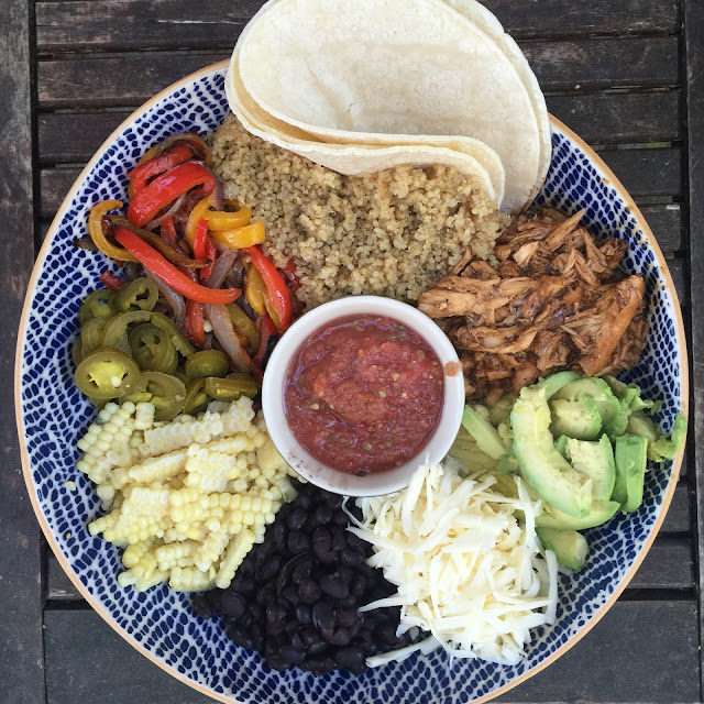Assemble the quinoa, veggies, chicken, avocado, black beans, corn, cheese and toppings in a large bowl and then let everyone serve their own bowls.