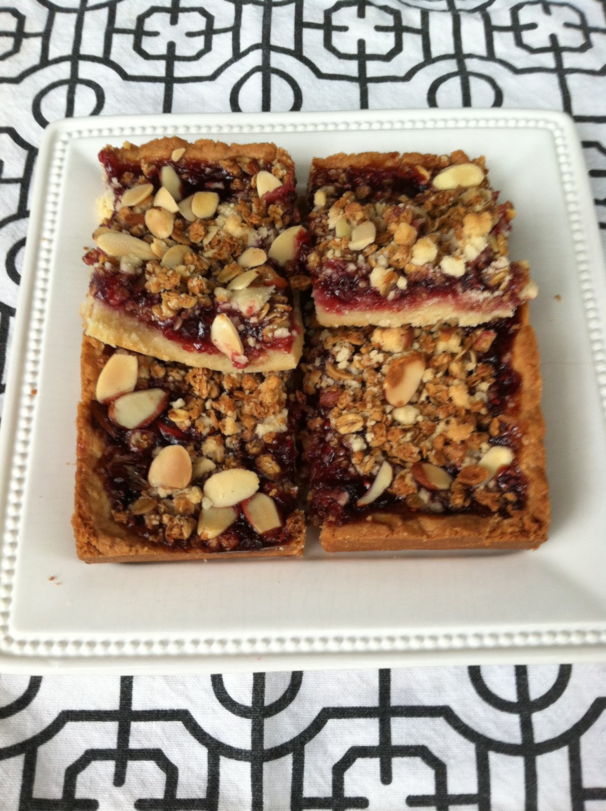 I have been wanting to make these bars ever since my girlfriend brought them over to our house a few weeks ago. They are ridiculously easy to make, like it took me maybe 10 minutes to whip them together. They are soooo good. The Raspberry Jam, paired with the granola, almonds and shortbread is pure heaven. Sterling loved them, they were a huge hit with the whole family.
