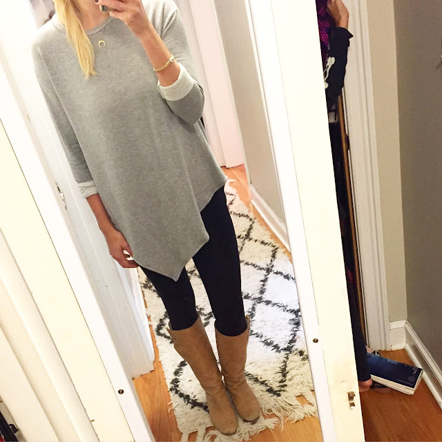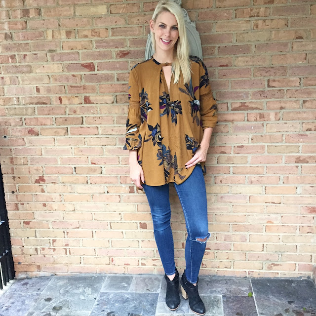 This Free People Blouse is a Fall favorite. In fact my mom and sister loved it so much they both bought one as well. It runs on the large side so size down, I am wearing an XS. This would be a great pregnancy blouse because it is super loose. Also comes in white and burgundy.
